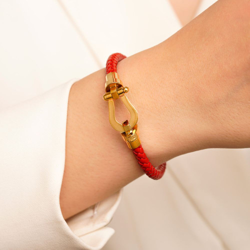 دستبند چرم استیل FRED سگک طلایی رنگ قرمز طول دستبند: ۲۱ سانت