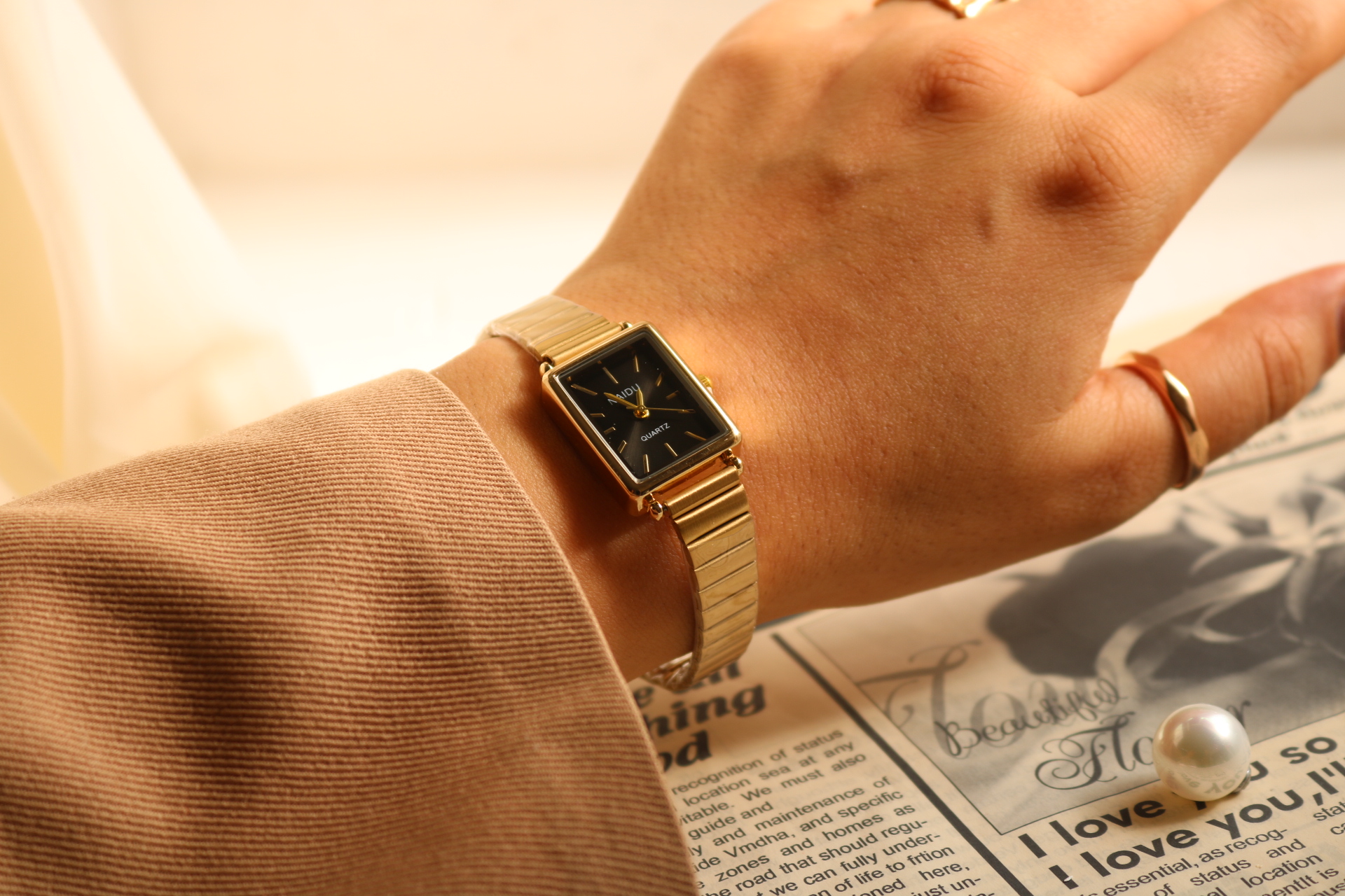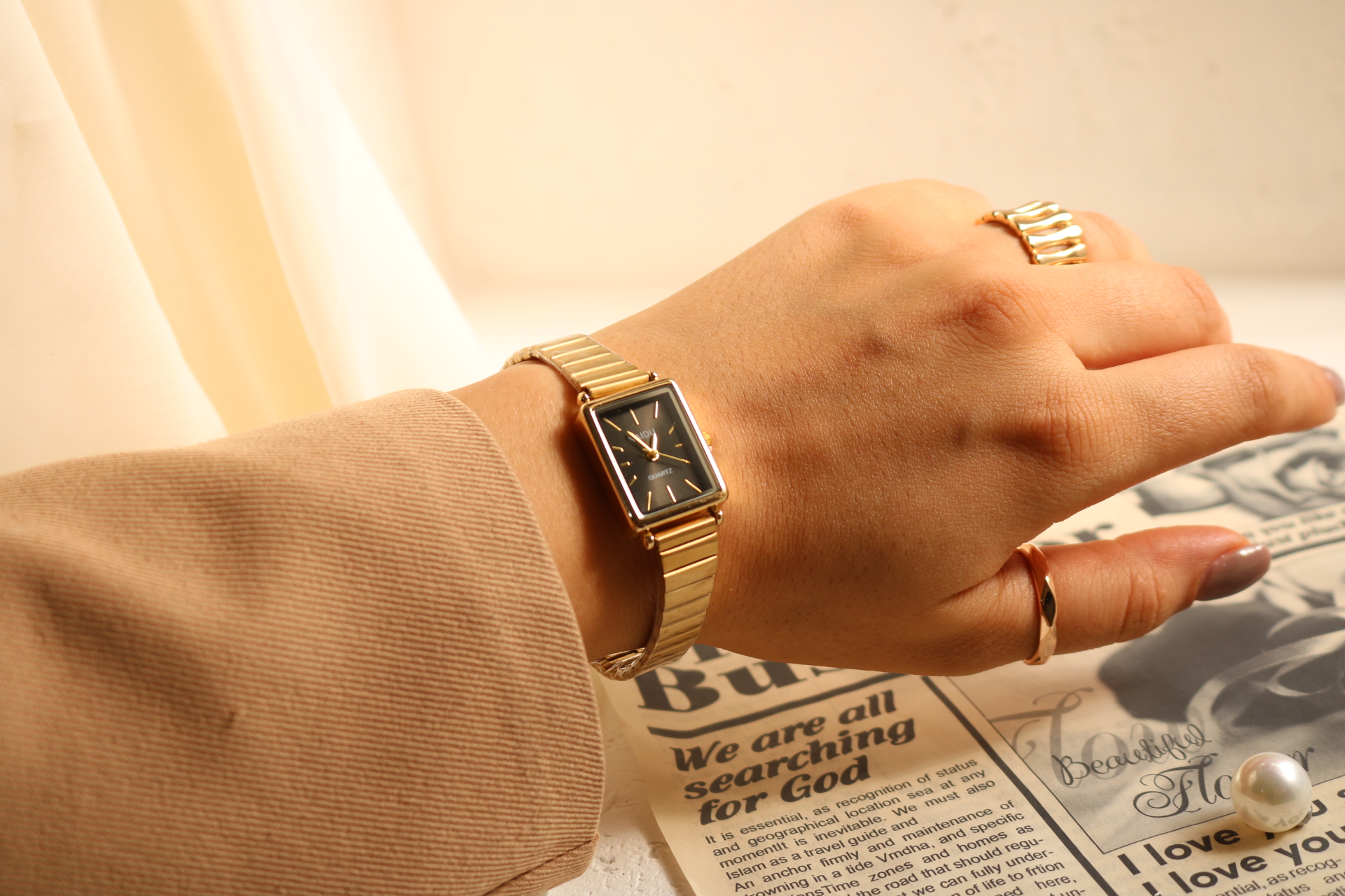 ساعت زنانه بند طلایی نایدو صفحه مستطیل مشکی بند و بک استیل قفل ریلی کیفیت عالی