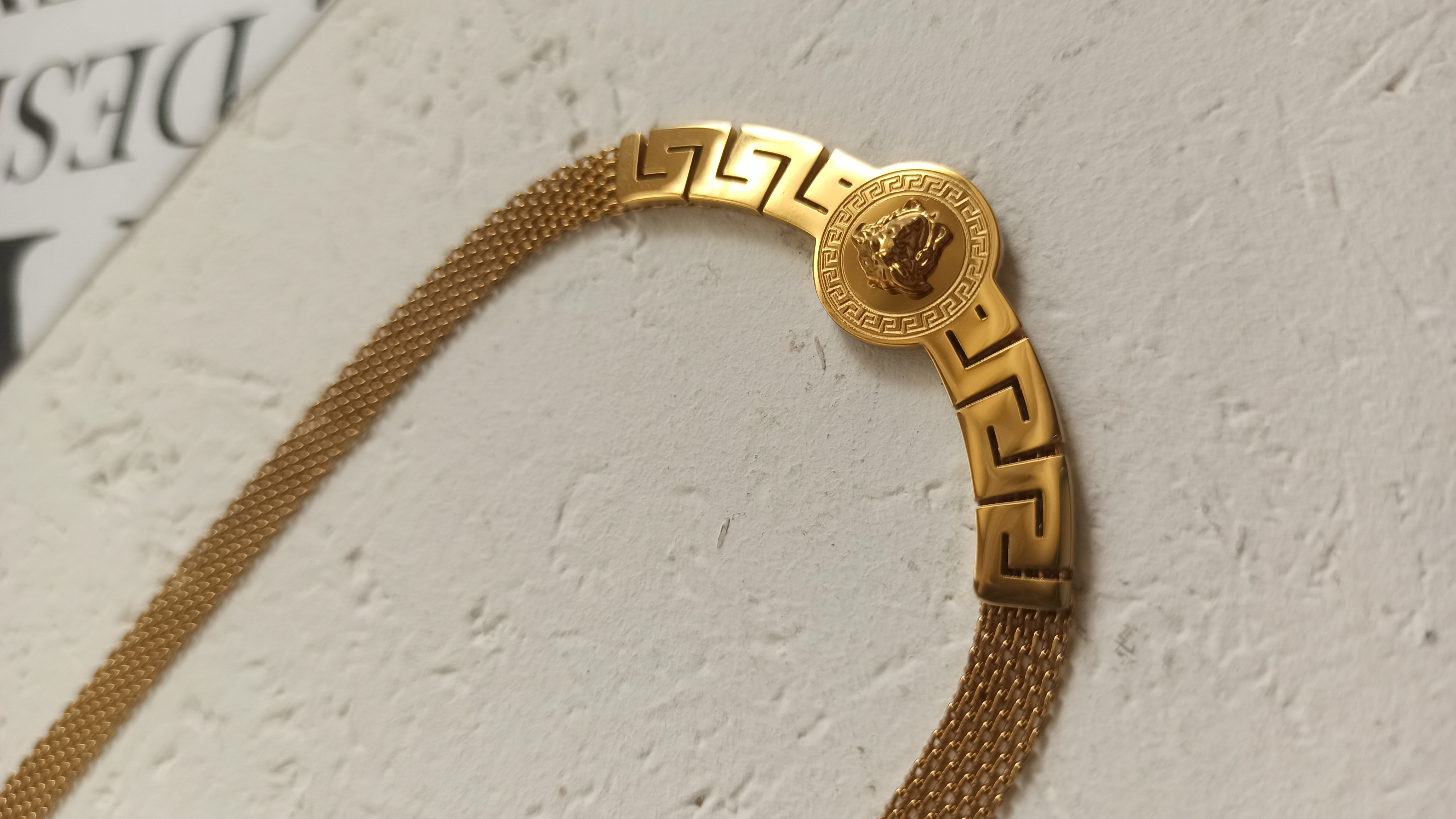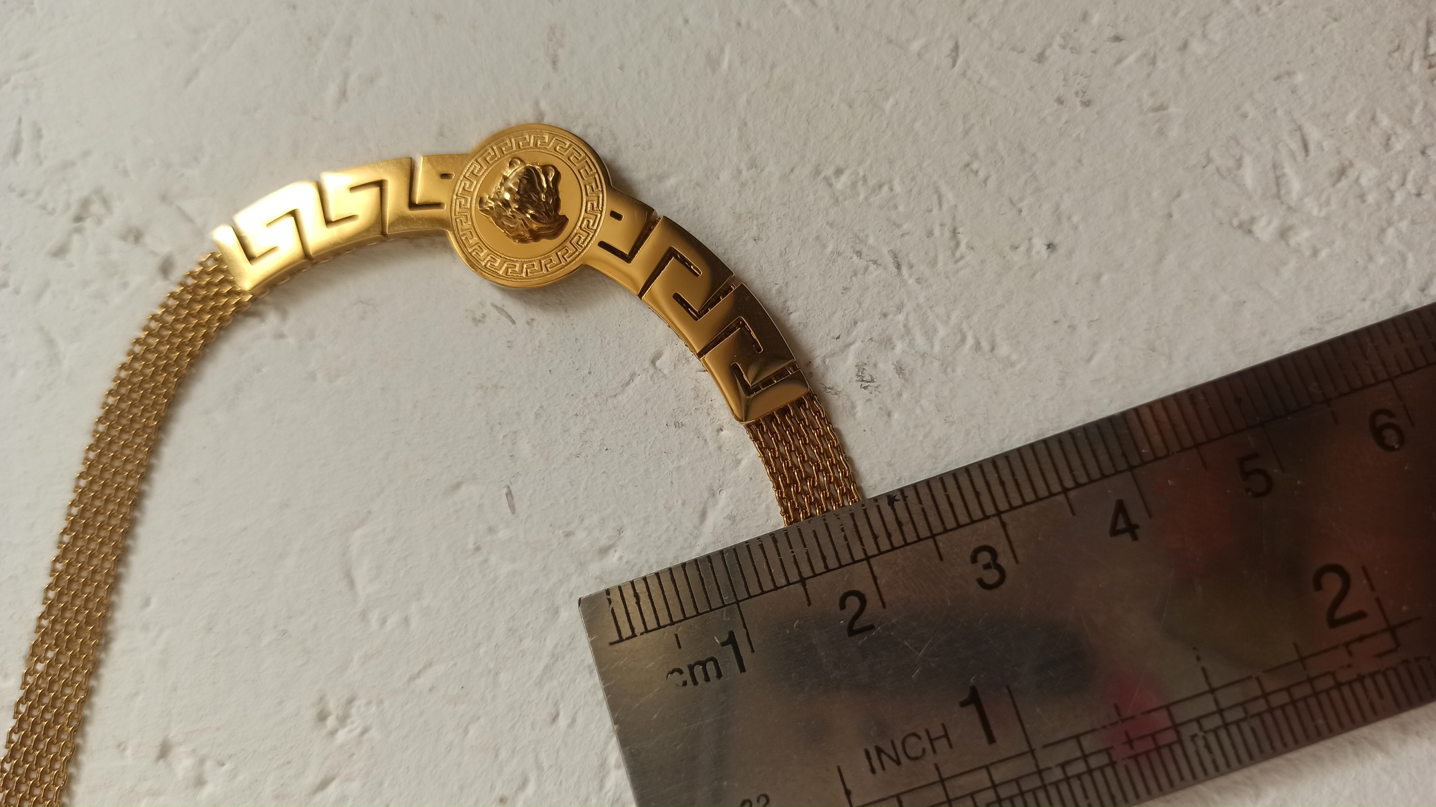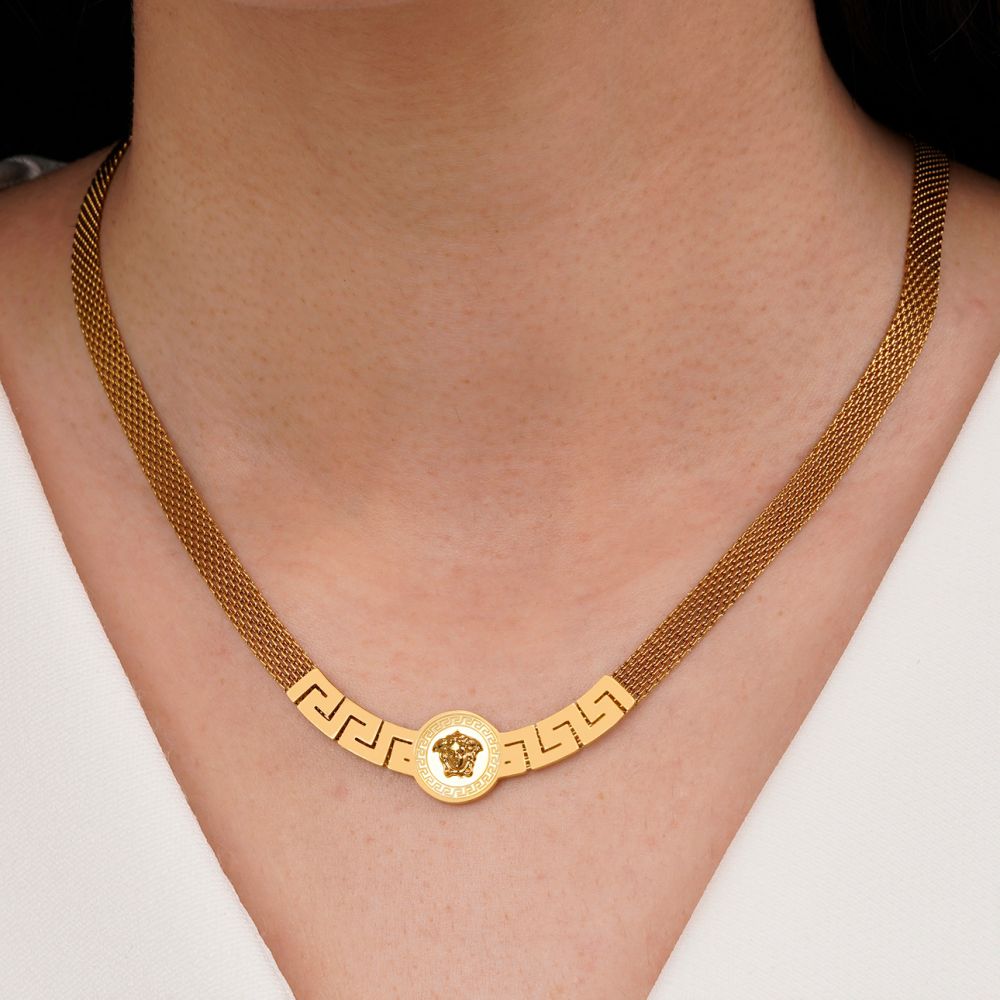 گردنبند استیل ورساچه رنگ طلایی فوق العاده زیبا و خاص کاملا مشابه نمونه طلا اندازه دور گردنبند ۵۰ سانت