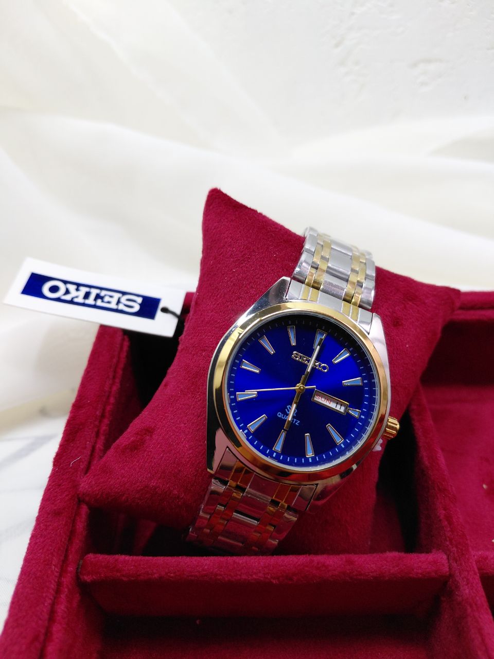 ساعت سیکو ۵ دو تقویم مردانه صفحه آبی رنگ بدنه سفید طلایی